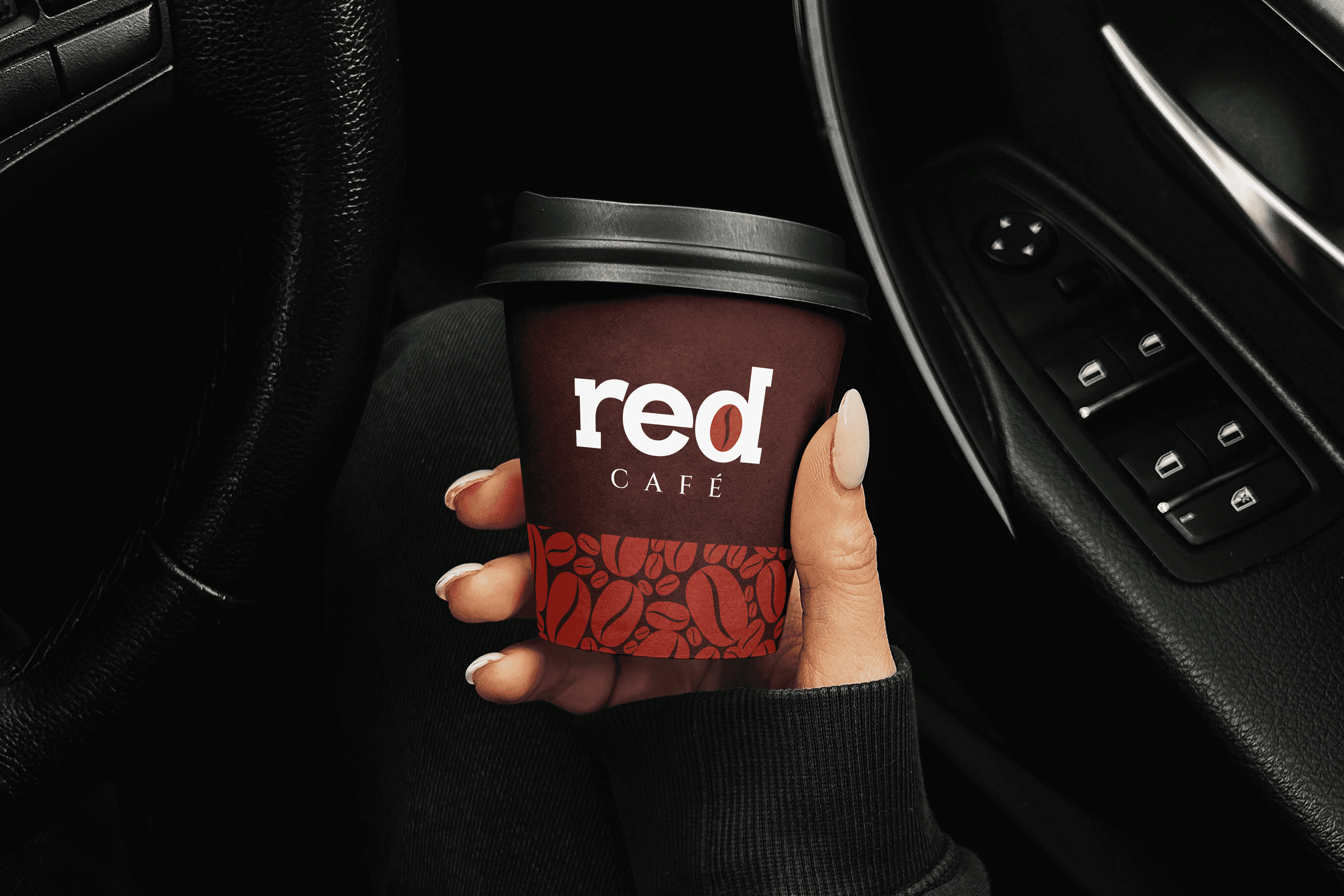 A bold, minimal logo design for Red Café, a Dhaka-based coffee shop. Extended with conceptual applications to visualize a cohesive, modern café identity.
