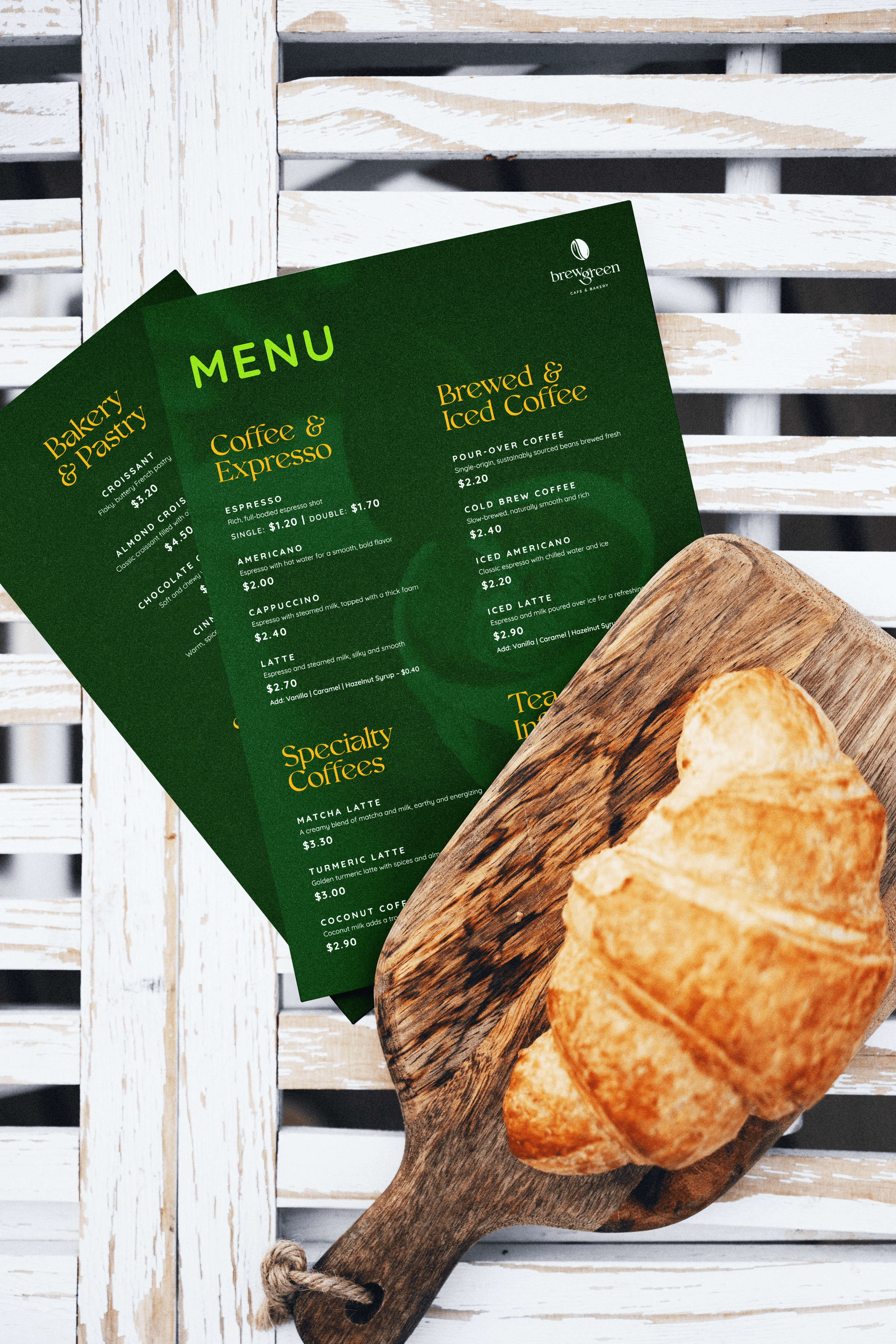 A fresh and modern identity for BrewGreen Cafe & Bakery, blending artisanal warmth with contemporary design through vibrant green tones and clear, elegant typography.