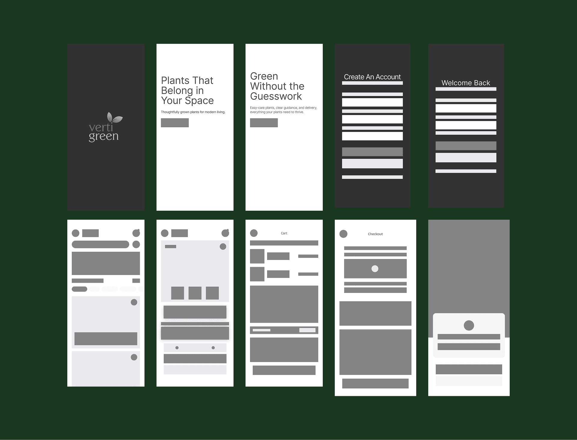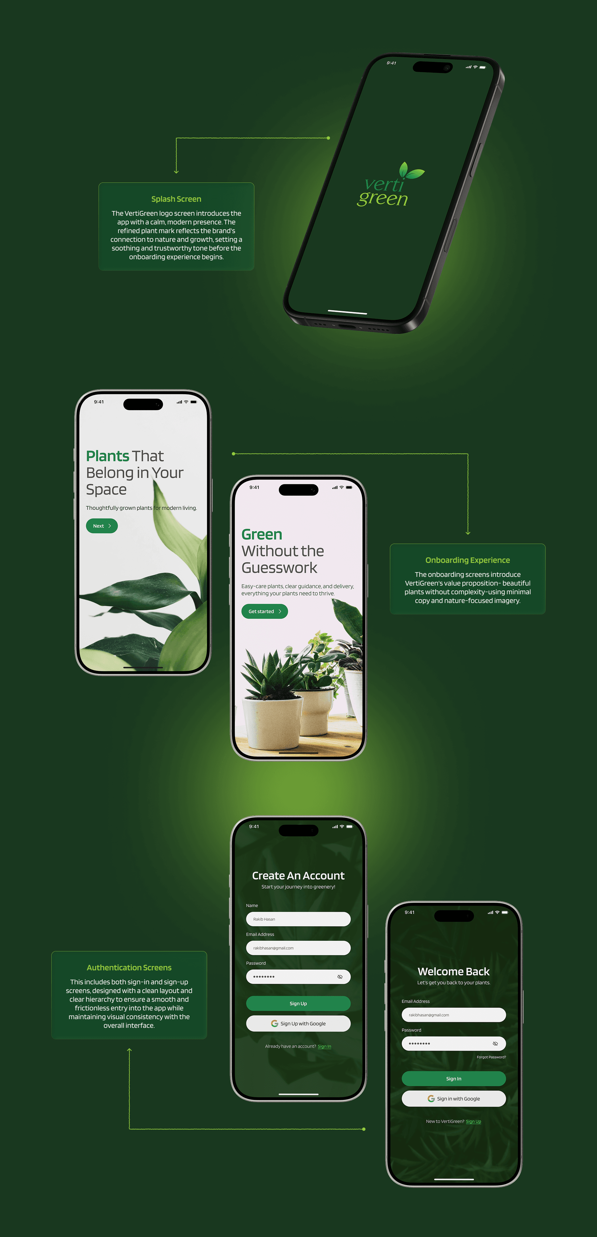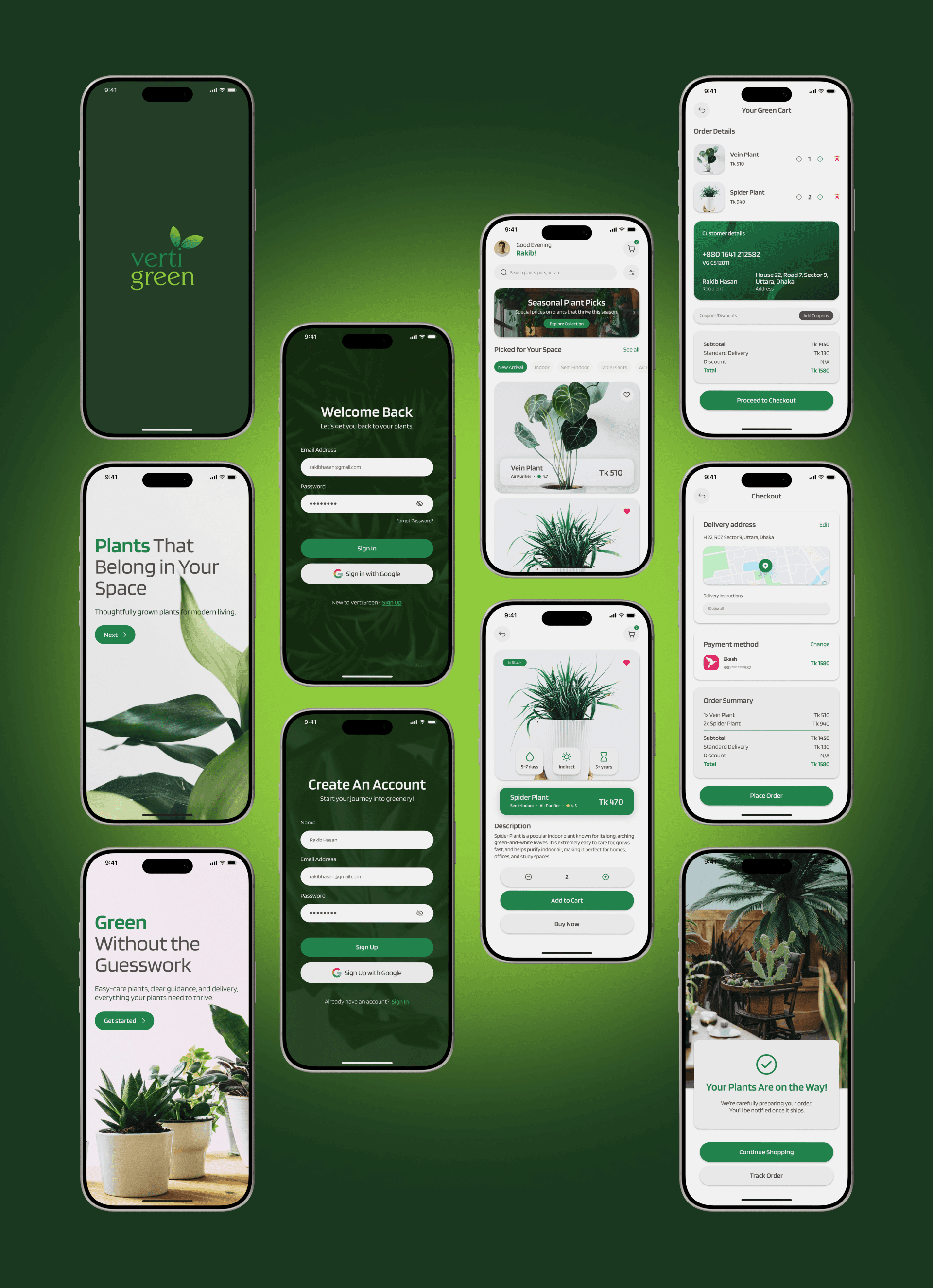 VertiGreen is a concept mobile app UI for a nursery brand, designed with calm, nature-inspired visuals and clear hierarchy to create a simple, intuitive shopping experience from discovery to checkout.